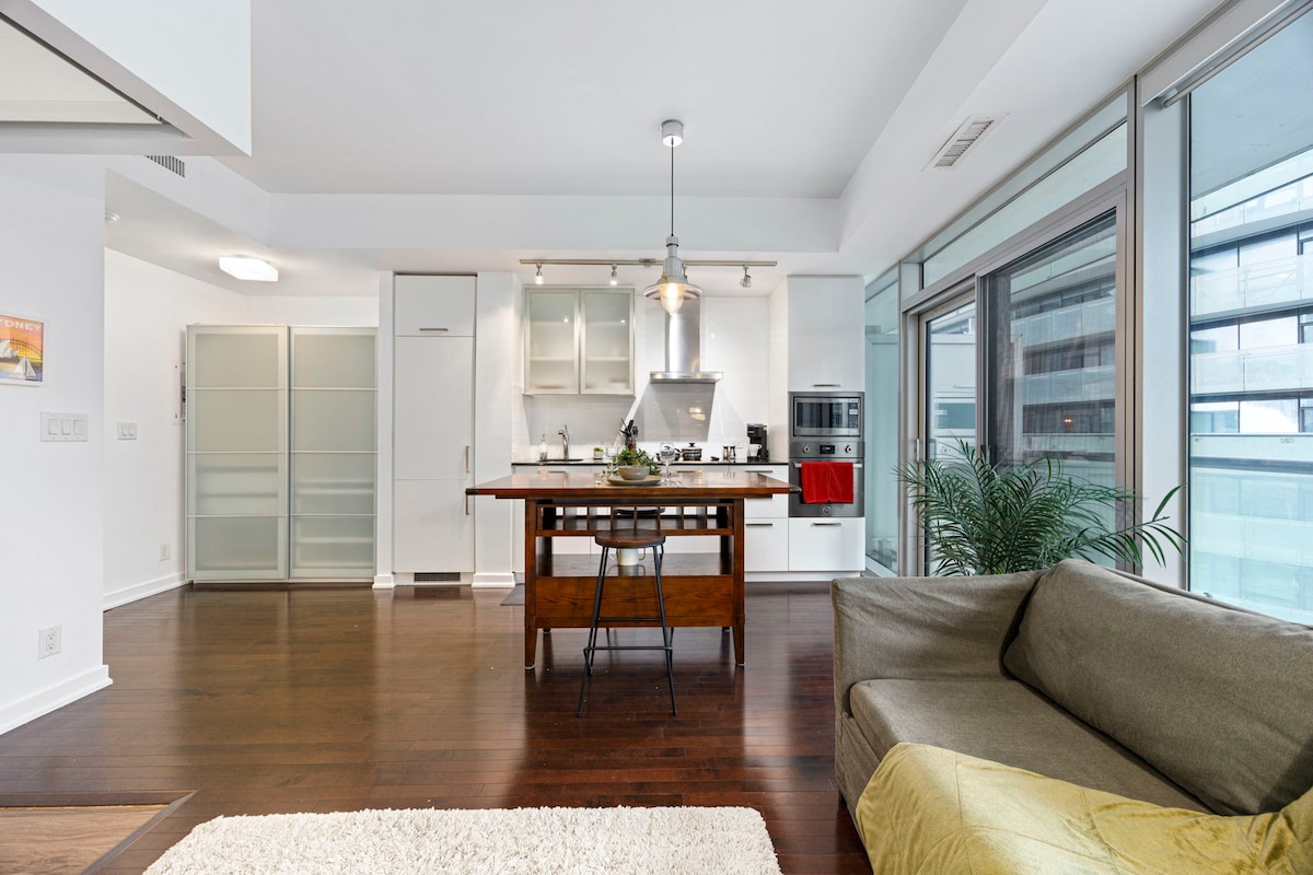 Zažij moderní život v centru města poblíž CN Tower, Scotiabank Areny a nábřeží. Tento světlý byt s otevřeným prostorem nabízí plně vybavenou kuchyň, pohodlný obývací pokoj a okna od podlahy až ke stropu. Užij si bezplatnou wifi, čisté povlečení a profesionální úklid. Ideální pro podnikání nebo volný čas, jsi pár kroků od nejlepších restaurací, zábavy a snadné dopravy. Při příjezdu je vyžadován platný průkaz totožnosti; klidné hodiny jsou od 22:00 do 8:00. Rezervuj nyní a užij si Toronto!