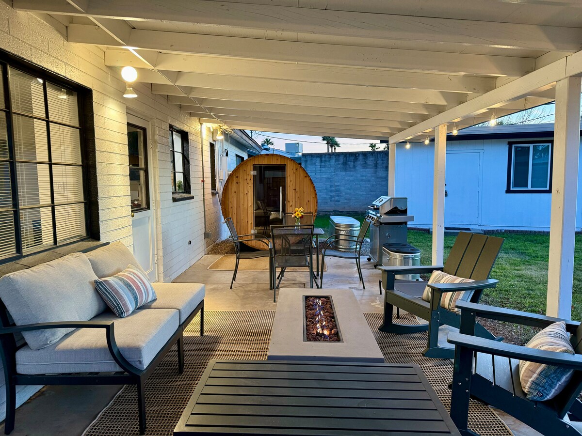 @SaunaHausPhoenix vychutnej si pravou finskou saunu a chladné koupání v tomto moderním domě Arcadia z poloviny století, který se nachází v centru města. 10 minut od letiště, Staré město Scottsdale. Vhodné pro psy a v blízkosti turistických tras. Nabíjení EV-2. Scottsdale Fashion Park a Downtown Tempe-ASU. Propanové ohniště, gril, 4 kola a oplocený soukromý dvorek vhodný pro domácí mazlíčky. Během několika minut se vydej na kole k ikonickým památkám. Walk the canal to tennis/pickle ball courts, grocery, brewery, coffee shop, restaurants, AZ Falls park.