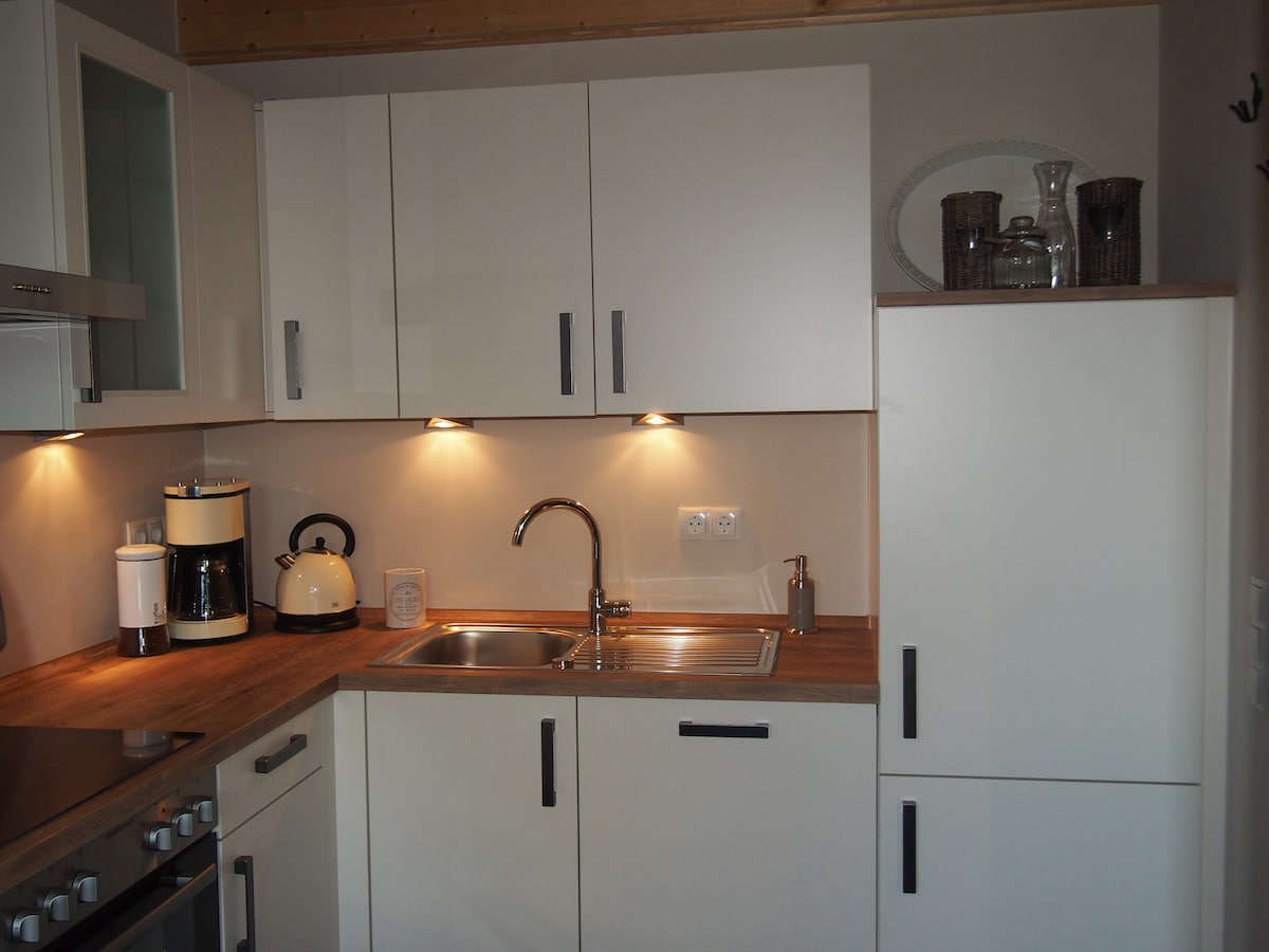 Útulný 70 m² velký apartmán se nachází v horním patře našeho rodinného domu a má vlastní vchod a terasu. Ložnice má 160 cm širokou manželskou postel s nočními stolky, skříní a televizí. Obývací pokoj je vybaven rohovou pohovkou, 120 cm postelí, skříní a TV. Z obývacího pokoje vede do špičatého patra schodiště, které šetří prostor (pozornost bez zábradlí!). Může se tam ubytovat 3 další osoby. Kuchyně je plně vybavena pro 6 osob (s myčkou nádobí).