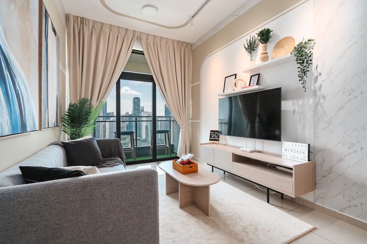 Tento 1pokojový apartmán má úchvatný výhled na panorama KL. Má 3místnou pohovku, obývací pokoj, jídelní stůl, kuchyň, stůl a velký balkon s výhledem na KL Tower a Petronas Twin Towers. Je vybaven 55" TV, vysokorychlostní Wi-Fi a manželskou postelí, na které se pohodlně vyspíte. *Druhou jednotkou tohoto apartmánu Dual Key je kompaktní studio s manželskou postelí, spíží, toaletou a koupelnou. Můžete se v něm ubytovat s přáteli, kteří cestují s vámi, a mít soukromí. Neváhejte se zeptat na další podrobnosti!