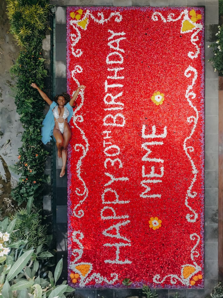 1,5–2 hodiny focení a natáčení dronem u tvého ubytování na Airbnb / v hotelu v Ubudu. Můžeš použít fotky svého květinového bazénku nebo jen vtipné či romantické fotky