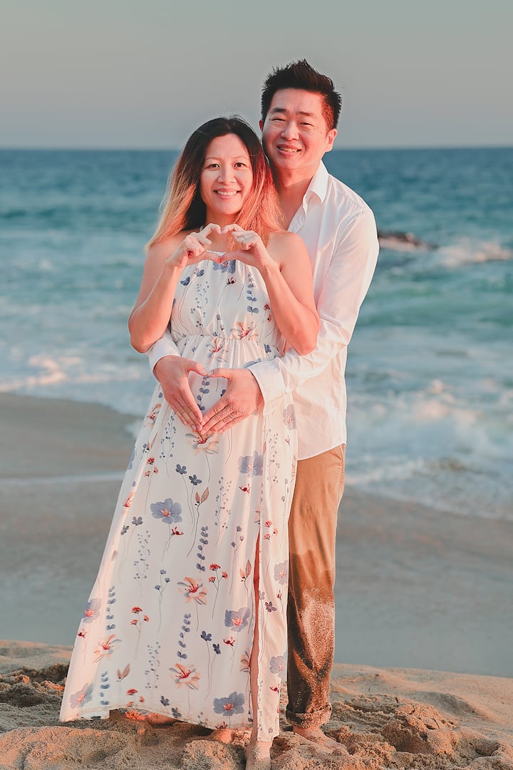 Krásné zasněné fotografie tebe, tvého budoucího dítěte a manžela nebo partnera na pláži během zlaté hodiny.