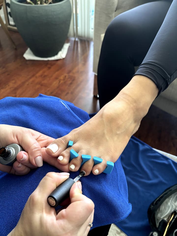 Služba zahrnuje: namáčení nohou, odstranění klasického laku, stříhání, tvarování a leštění nehtů na nohou, péči o kůžičku a mozoly, aplikaci pleťového mléka, výběr klasického laku na nehty. (Odstranění gelu není zahrnuto)