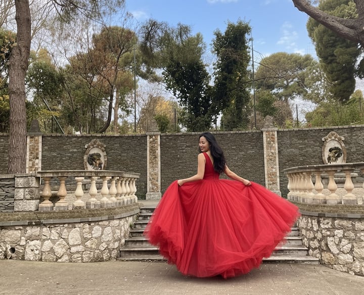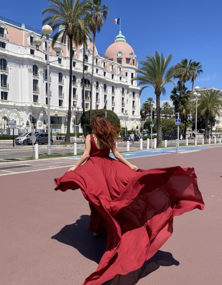 Focení v nabíraných šatech na Promenade des Anglais před Negresco v Nice