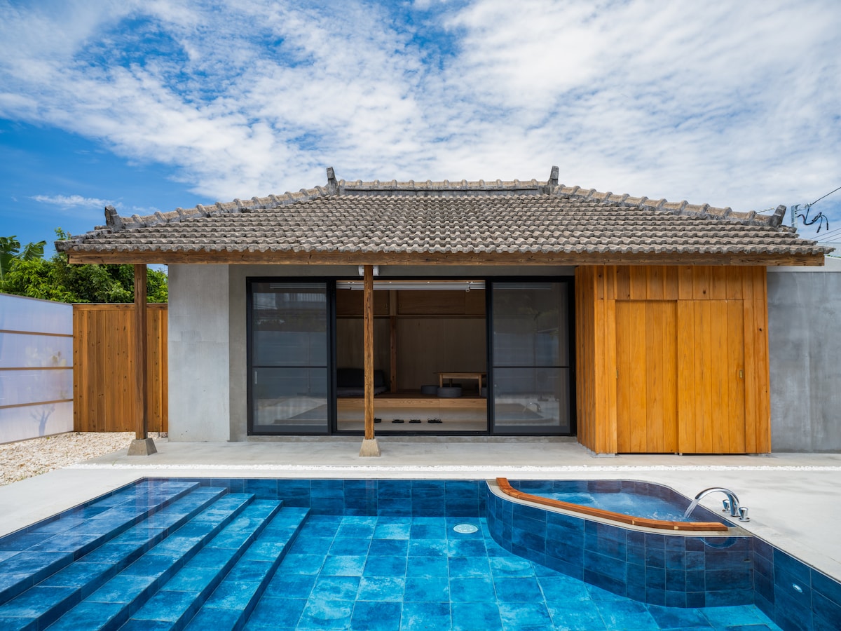 Okinawská dřevěná architektura, soukromý bazén, pronájem celého domu, starý dům, venkovní lázeň, Steinway1919