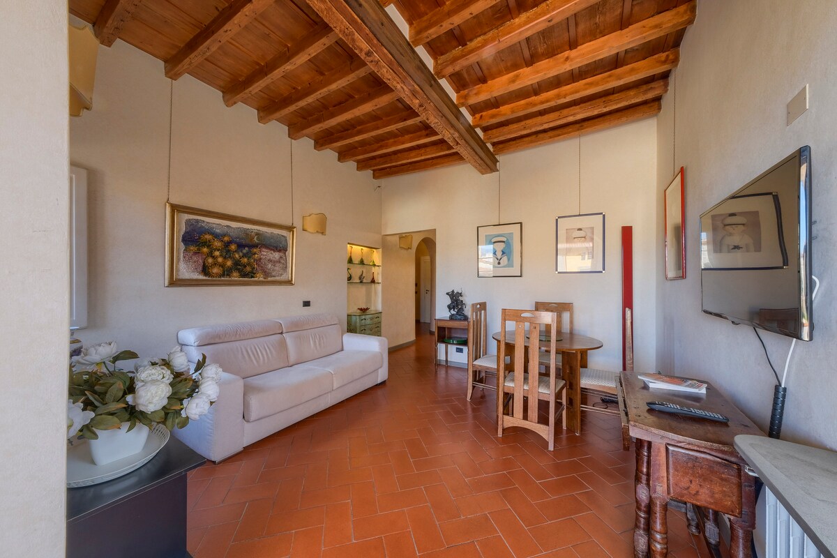 Dvoupokojový apartmáně v historickém centru Pontassieve, ve 2. patře malého bytového domu bez výtahu, 10 minut pěšky od vlakového nádraží a autobusové zastávky s častými spoji do Florencie (23 minut), Mugello, Consuma, Vallombrosa a luxusního outletu The Mall. Skládá se z 1 ložnice s rozkládací samostatnou postelí, TV, velkým šatníkem a 2 okny s výhledem na řeku a most Ponte Mediceo, 1 kuchyně s obývacím pokojem s TV s Google Cast, pohovkou, kterou lze přeměnit na samostatnou postel, a 1 koupelny se sprchovým koutem.
