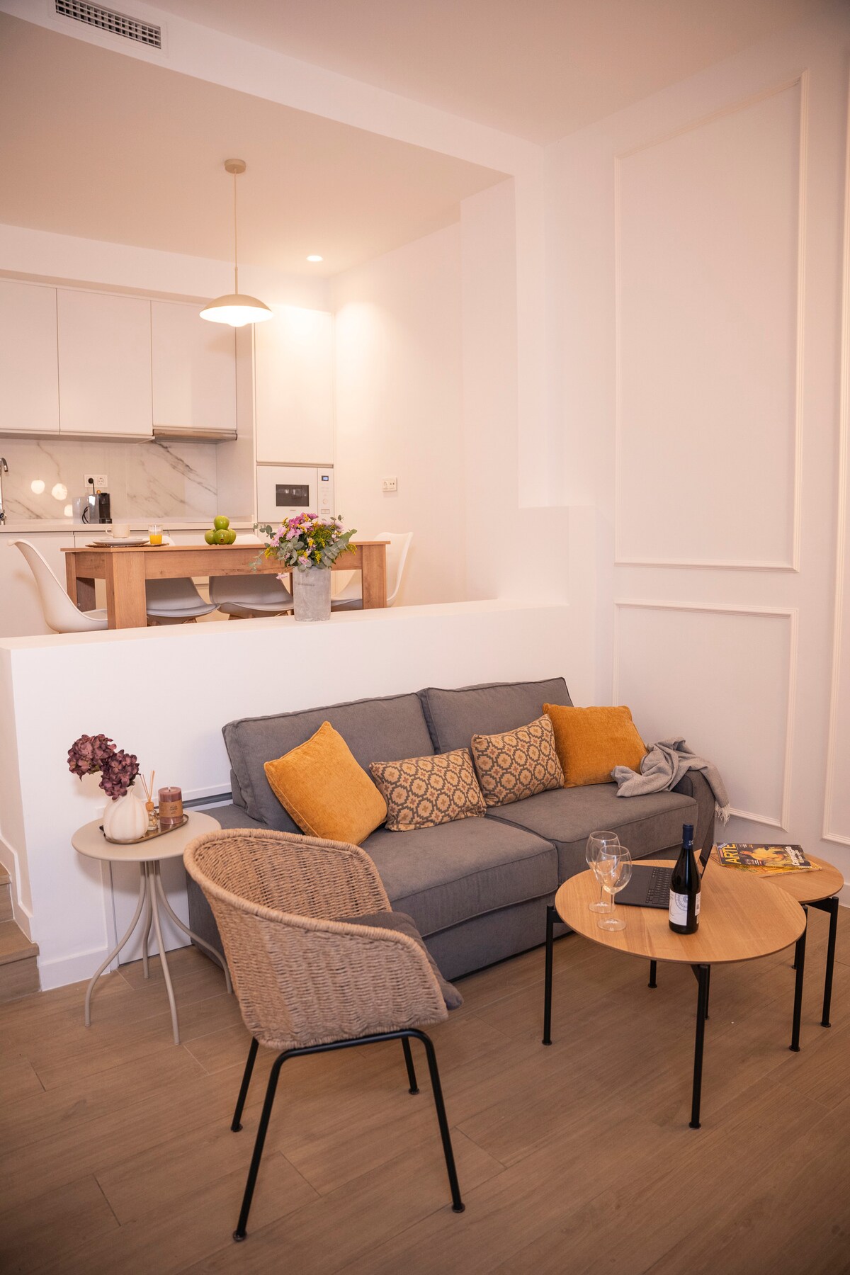 This 83 sqm apartment is ideal for up to 6 people. The space features comfortable king-size (180x200) and queen-size (160x200) beds, a spacious living area and a colorful private terrace. Obývací pokoj evokuje středomořskou atmosféru díky teplým barvám nábytku a dřevěným jídelním stolům. Pro maximální pohodlí si lehni na soukromou terasu, podrž sklenici tinto de verano a užij si teplé noci v Seville. Apartmán má také vybavenou kuchyň a prostornou koupelnu.