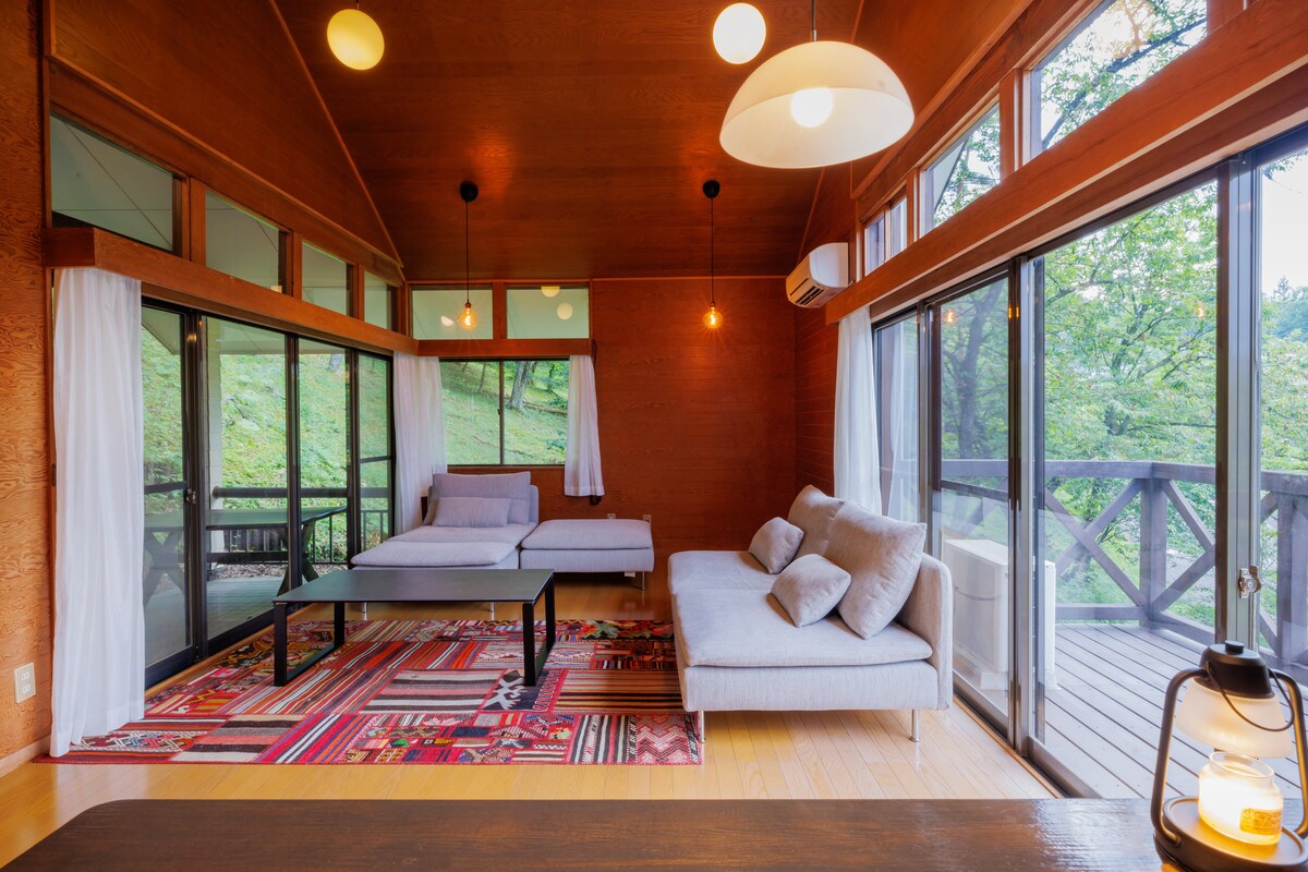 Jedná se o novou chalupu postavenou v roce 2022. Vstup do elegantního domu s černými vnějšími stěnami, z kamenné chodby vedoucí do obývacího pokoje s vysokým stropem ti umožní zapomenout na svůj každodenní život. Venkovní vana je obklopena stromy a v zimě si můžeš vychutnat relaxační vanu s výhledem na sníh. Užij si soukromé divadlo v obývacím pokoji a ložnici se 100palcovou projekční plochou. Displeje a stoly jsou k dispozici také pro tvůj pracovní prostor.