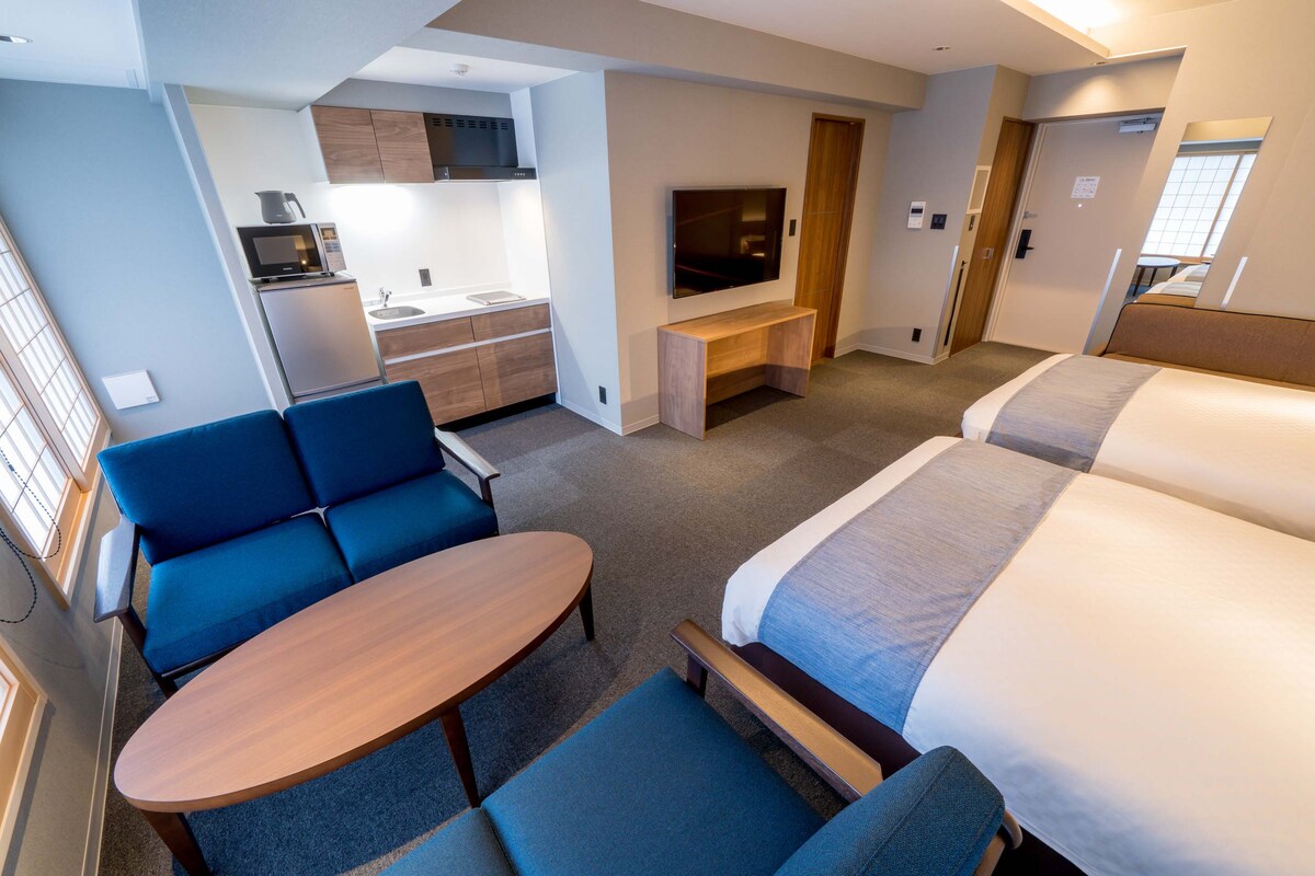 B2 Kyoto Shijo Kawaramachi large price comfortable 3 person bed good sleeping, there is a balcony, kitchen, small table, light-speed internet side can also go to work on the tourist side of the road