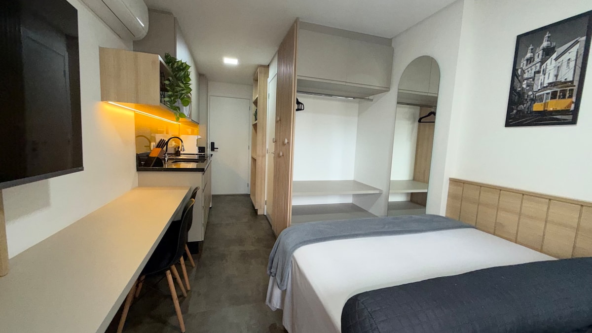 Designové studio navržené architekty v srdci Curitiby. Plně zařízené moderním a moderním dekorem, špičkovými spotřebiči a bezvadnými povrchovými úpravami. Pojme až 3 osoby s manželskou postelí a jednomístnou postelí. Plně vybavená kuchyň, vysokorychlostní Wi-Fi, Smart TV a klimatizace. Ideální pro práci nebo volný čas. Výsadní poloha v centru, blízko všeho. Užij si prvotřídní hostitelský zážitek v jedinečném a sofistikovaném prostoru! Sprcha je dokonalá😍