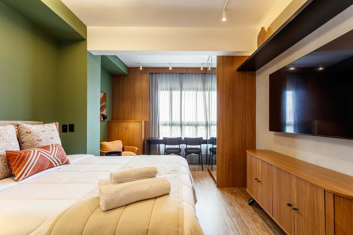 Užij si bohémskou a uměleckou Vila Madalena, plnou barů, restaurací a kaváren. Můžete poznat region nebo dokonce podniknout výlet do městských parků na kole, které je k dispozici zdarma. Přijedeš pracovat? Soustřeď se na ni u pohodlného stolu s výhledem na zelený balkón s krásným výhledem na vrcholky stromů. Koneckonců si užijte posilovnu, bazén, saunu a kulečníkovou místnost pro svůj kompletní odpočinek.