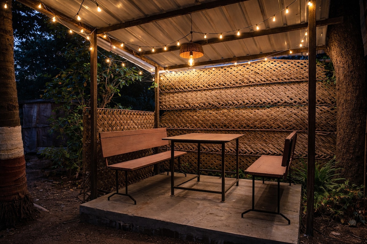 * Families preferred. No smoking or drinking. * Escape to our cozy homestay in Shrivardhan, just a few minutes from the beach. The space is most comfortable for 4 guests due to a single bathroom, but we can accommodate up to 5 adults. Enjoy air-conditioning, inverter backup, TV and Wi-Fi for a comfortable and convenient stay. While we don’t offer food or silverware, our neighbours prepare tasty Konkani vegetarian and non-veg meals, which will be served in our backyard.