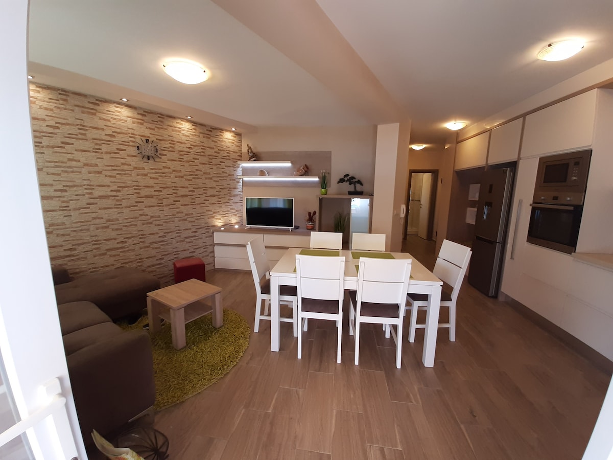 Odpočiň si s rodinou v tomto útulném domě. 3 ložnice (dvě s manželskou postelí a jedna se dvěma samostatnými lůžky), koupelna se sprchovým koutem a další samostatnou toaletou, terasa se stolem a židlemi pro stolování, balkon se židlemi pro odpočinek, plně zařízená kuchyň s myčkou nádobí, obývací pokoj s TV/SAT, Wi-Fi, klimatizace, pračka.