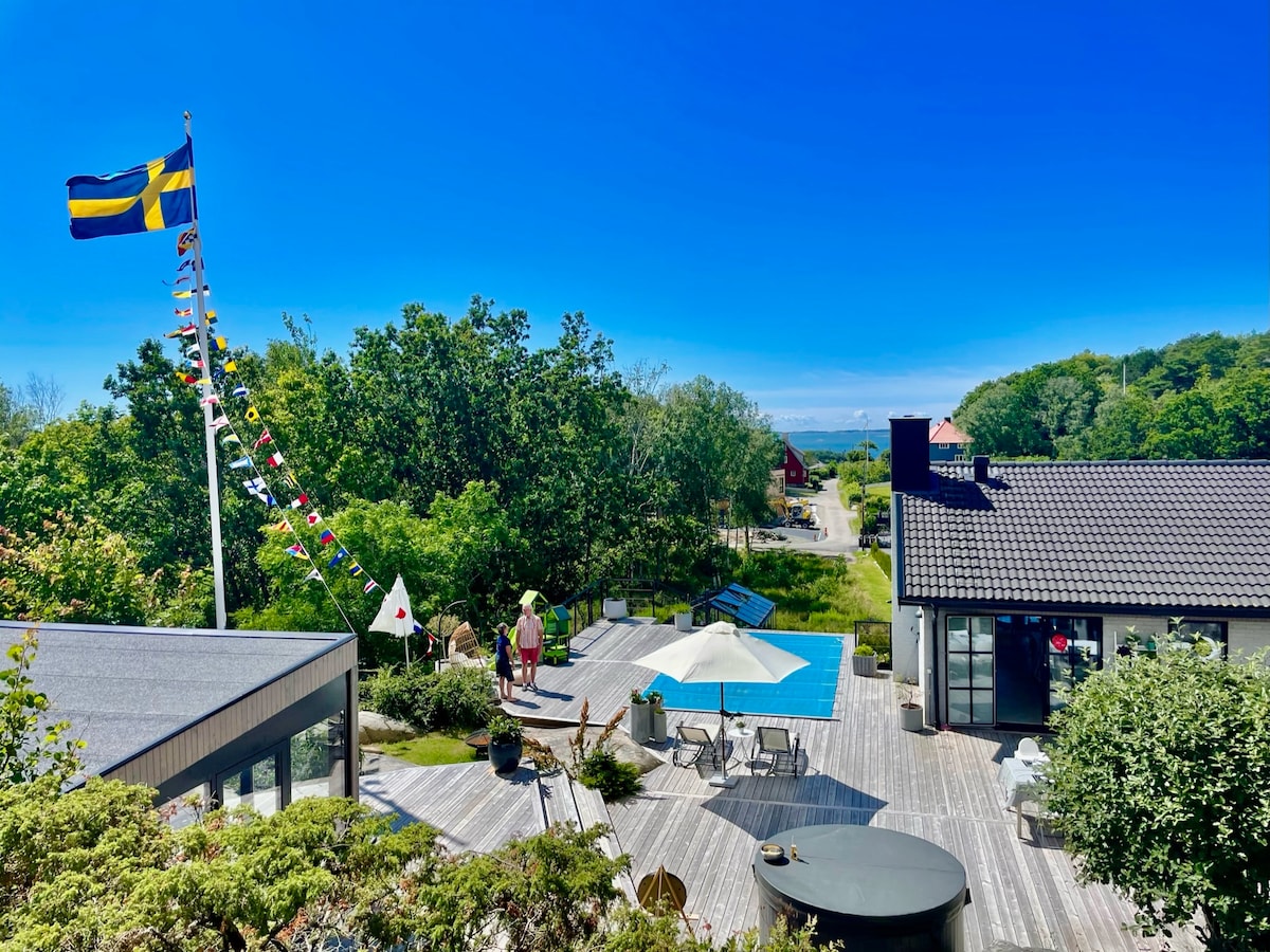 A newly renovated house of 180 m2 in Kyrkesund with panoramic sea view. 11 beds, indoor pool and sauna. The house is top notch and is located 100 meters from the sea. Wonderful pool in the newly renovated room (80 m2) with a sauna and shower. Lovely balcony with a magic sea view over the horizon. Both bathrooms are newly renovated . Perfect house for two families, lovely nature experience. Housekeeping, sheets and towels are included as a service.