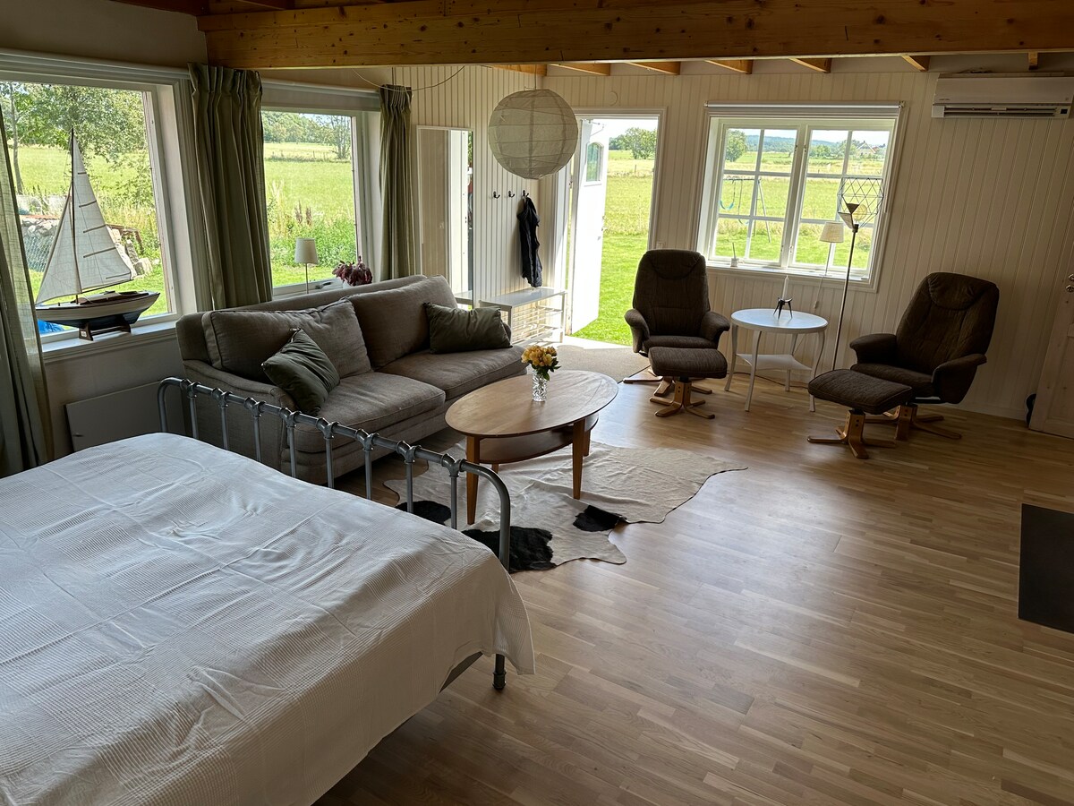 Samostatně stojící dům na statku 8 km od centra Falkenbergu. Přibližně 300 m od pláže, 1 km od přírodní rezervace Grimsholmen, Kattegattsleden mimo uzel. Ve velké místnosti je kuchyň s myčkou nádobí. K dispozici jsou dvě jednolůžka. Půl schodiště nahoru jsou dvě lůžka. Schodiště v koupelně se sprchou, WC, pračkou a žehličkou. Dva venkovní prostory s menším a větším zahradním nábytkem. Matrace, peřina a polštář jsou k dispozici pro postele. Povlečení a ručníky mají hosta s sebou.