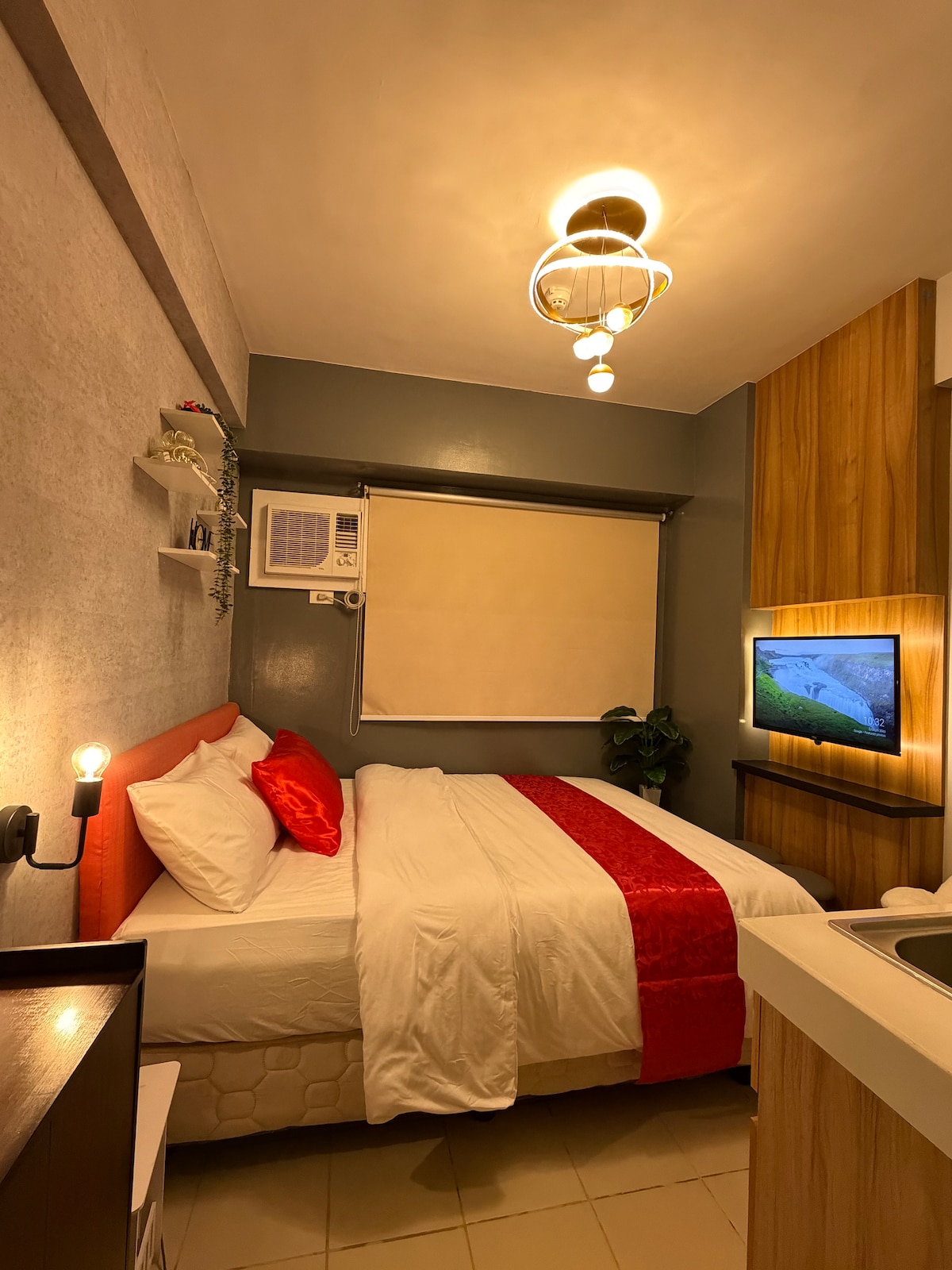 Book this luxury stay at the center of BGC. Everything is just a few steps away. Prime offices and high end malls surround Uptown Parksuites. Experience a cosmopolitan getaway at the Uptown Mall. Explore unique food and shopping concepts. Party the night away at premier bars right at your doorstep. Unwind in our Mid Century Modern bedroom unit. Comforts include a 55 inch SMART TV, 400 MBPS internet and a study area. Enjoy a comfortable and stylish experience at this centrally-located place.