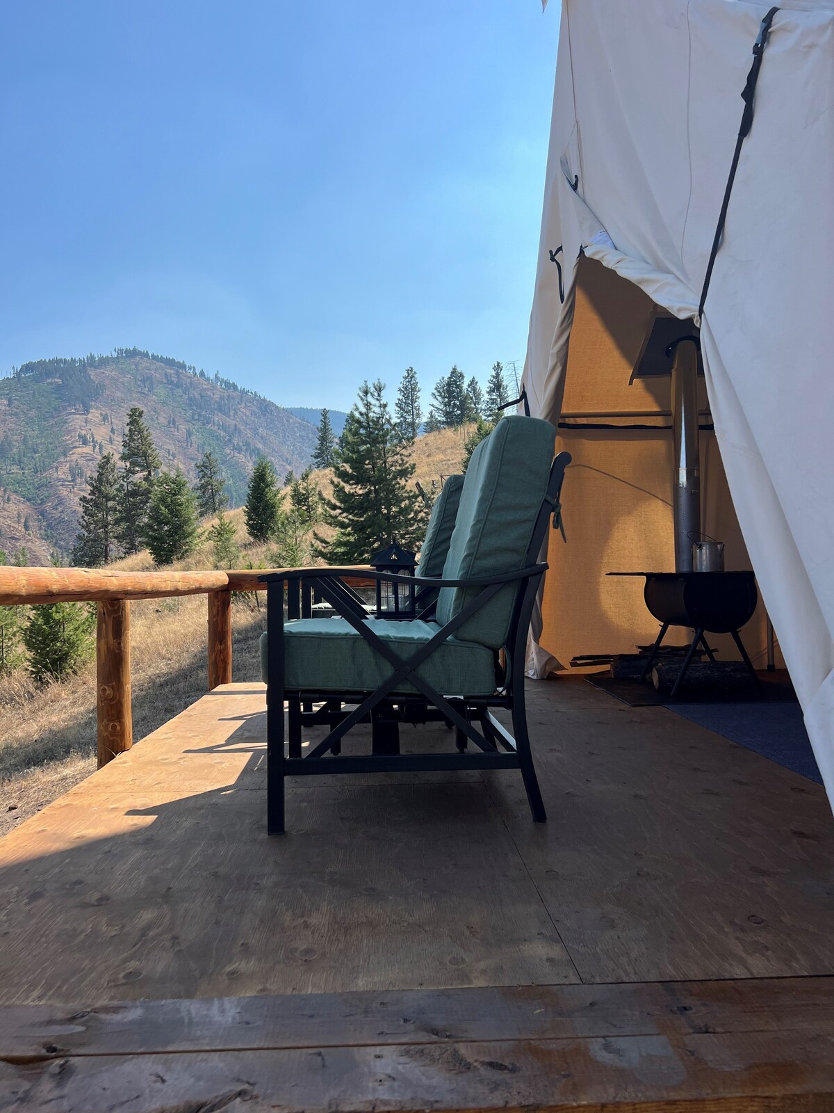 Užij si nejlepší výhled na planetu z terasy svého 12x17 Montana Canvas stan, který stojí na vyvýšené dřevěné plošině vyrobené z místně mleté borovice. Budeš mít vše, co potřebuješ k tomu, aby sis pobyt užil/a. Elektrická světla a topení, připojení pro telefon nebo notebook, Wifi (někdy se liší signál), ohniště a dřevo, propanové hořáky, studna přes hadici obytného vozu a krytá toaleta ve stylu kompostu. Venkovní sprcha s teplou vodou dodávanou ohřívačem vody na vyžádání.