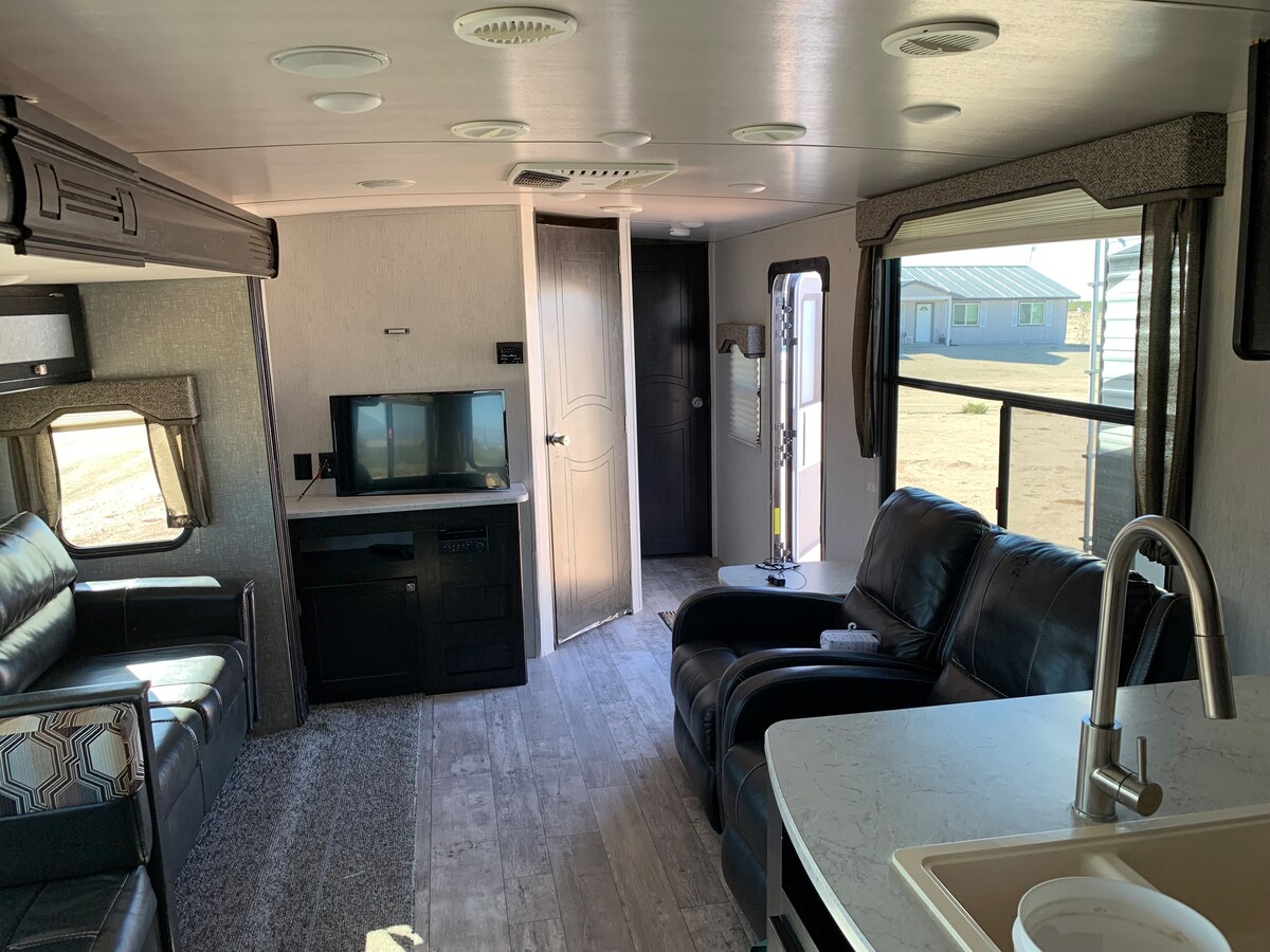 Krásný karavan vhodný pro domácí mazlíčky z roku 2018 s 1 manželskou postelí v ložnici a 1 koupelnou. Plně připojen k elektřině, vodě a septiku. Patrové postele v plné velikosti v zadní části obytného přívěsu. Má plně vybavenou kuchyň s plynovým sporákem, mikrovlnnou troubou a lednicí. This camper is in a private setting on my 5 acre property with a parking place in front of the camper. Velmi klidná čtvrť se 3 domy. Včetně energií (elektřina, voda, odpadky a wifi). První 2 nádrže s propanem pro dlouhodobé pobyty. Vhodné pro domácí mazlíčky a LGBTQIA+.