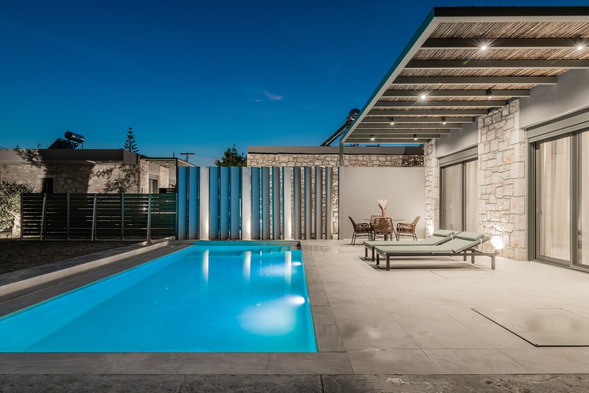 This impressive property is located in Akrotiri, on top of a hill, enjoying clear panoramic views both towards the port and the town of Zante. It is conveniently situated only 4 km distance from the harbor and the main square of the old town. The BoConcept furniture in the living room, the bedroom with COCO-MAT’s natural sleep systems and bedding as well as the soft touch of high quality Guy Laroche linen complete the feeling of a luxury stay.