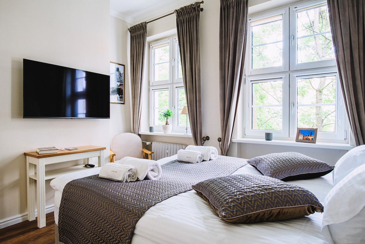 Moderní apartmán v centru Gdaňsku s výhledem na řeku Motlawa, poblíž vyhlídky, v blízkosti Muzea 2. světové války. Hlavní ložnice typu ensuite. Druhá ložnice se dvěma kontinentálními samostatnými lůžky s možností spojení. V obývacím pokoji je rozkládací pohovka. Z oken apartmánu si můžete vychutnat výhled na Staré Město. Další vybavení: garáž, prádelna, terasa, restaurace. Parkovací místo je k dispozici za příplatek.