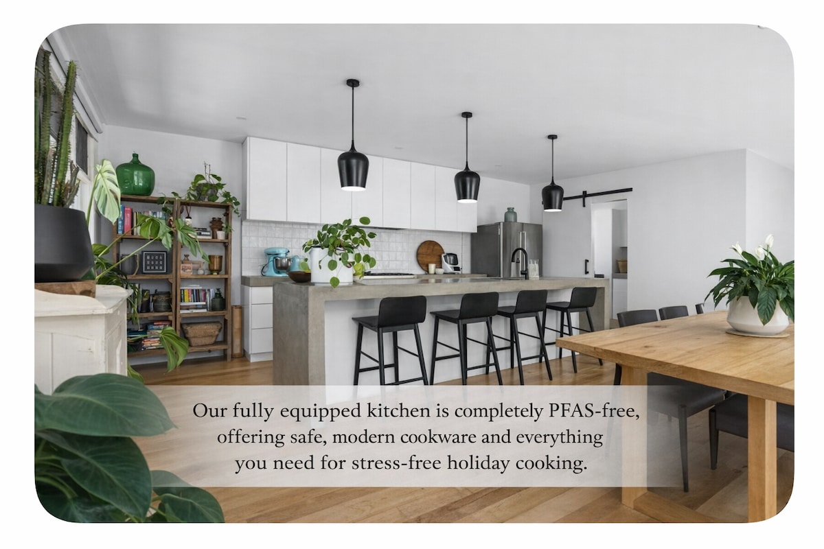 Inspirován oceánem a přírodou, Sol nabízí jedinečný dům na pobřeží v Rosebud, na poloostrově Mornington. Díky uklidňujícím interiérovým kouskům, neutrální paletě barev a vybavení včetně lázní a venkovní sauny je toto místo místem k odpočinku a dobití energie 😴