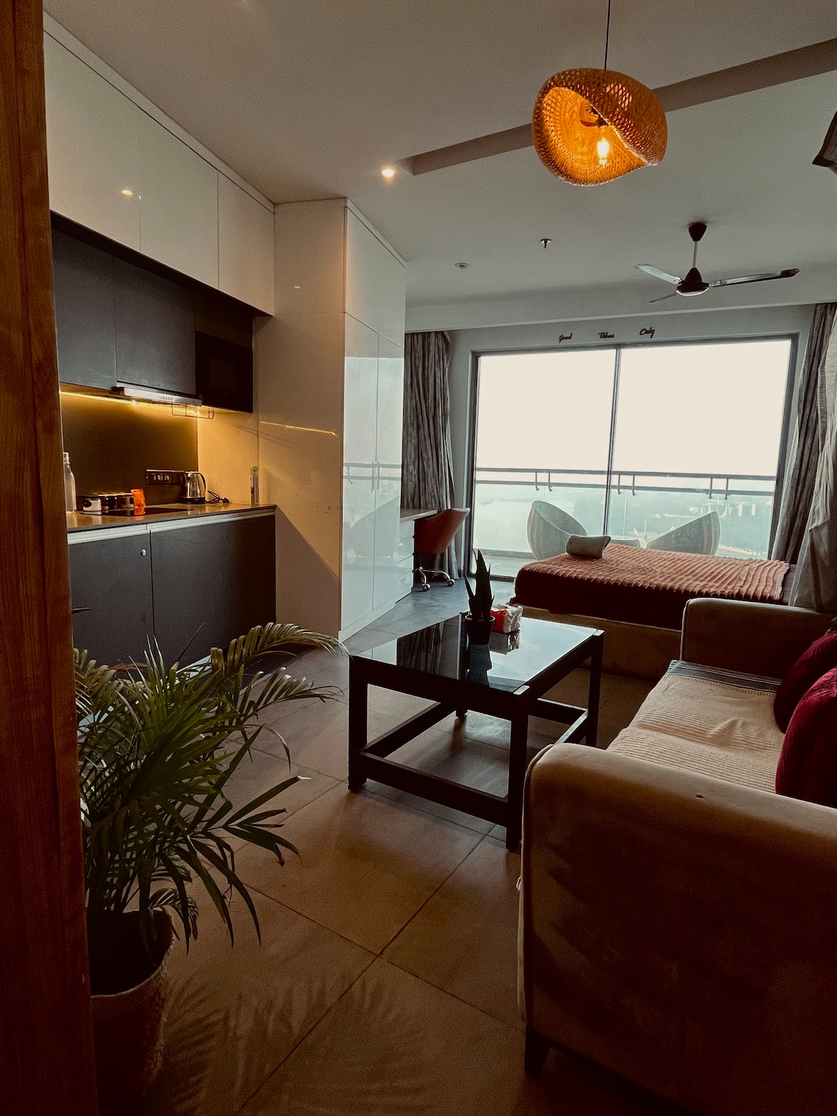 Introducing our exquisite luxury studio apartment: Nestled in the heart of the city, this opulent studio boasts modern elegance and unparalleled comfort. The open-concept design invites you into a spacious haven, bathed in natural light from the large windows that offer breathtaking city views. This apartment is on the 41st floor in one of the tallest sky scraper in Delhi - NCR. The apartment has a river facing view from the balcony!!