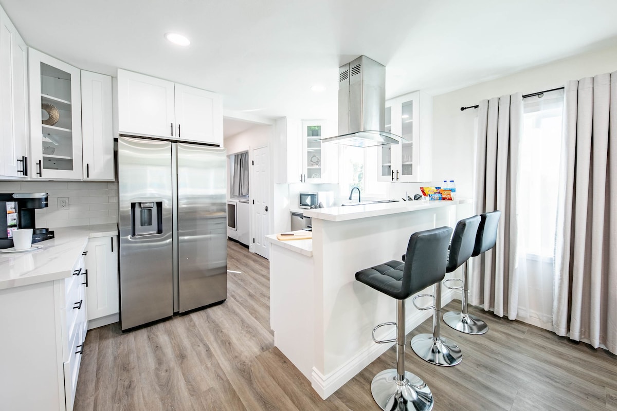 Vítej v našem moderním domově! This 3-bed, 2-bath getaway sleeps 6 (2 queen beds & 2 Twin XLs)—ideal for families or friends. Rychlá cesta do: • DTLA – 20 minut • Pasadena – 15 minut • LAX – 40 minut • Univerzální – 30 minut • Disneyland/Knott's – 30 minut • Pláže – 40 minut • Hollywood a Beverly Hills – 35 minut Na dvorku našeho domu bude stavba a během dne může být hluk. Stavba bude probíhat od 7:00 do 17:00, ale ne každý den.
