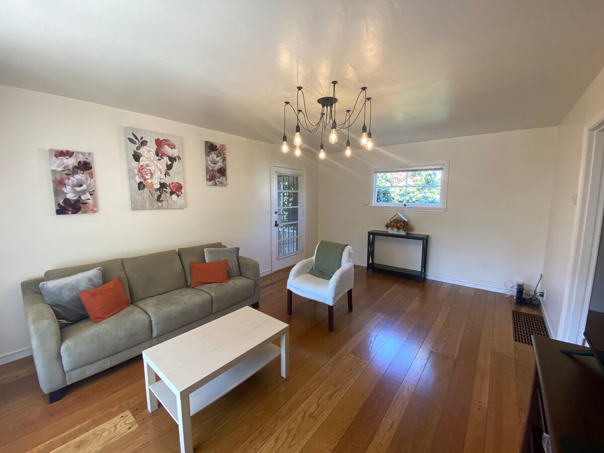 Užij si slunečný, zařízený domov s 1 ložnicí a 1 koupelnou, soukromým vchodem, velkou manželskou postelí, sprchou a vanou, plně vybavenou kuchyní s myčkou, jídelním koutem a obývacím pokojem s krbem, rozkládací pohovkou, Roku TV, Wi-Fi a pračkou/sušičkou. Nachází se v bezpečné čtvrti Alameda, kterou lze procházet pěšky, v blízkosti kaváren, přístavů, obchodů, parků, trajektu do San Francisca a autobusu na letiště v Oaklandu. Čisté, pohodlné a uklizené – tvůj dokonalý domov daleko od domova.