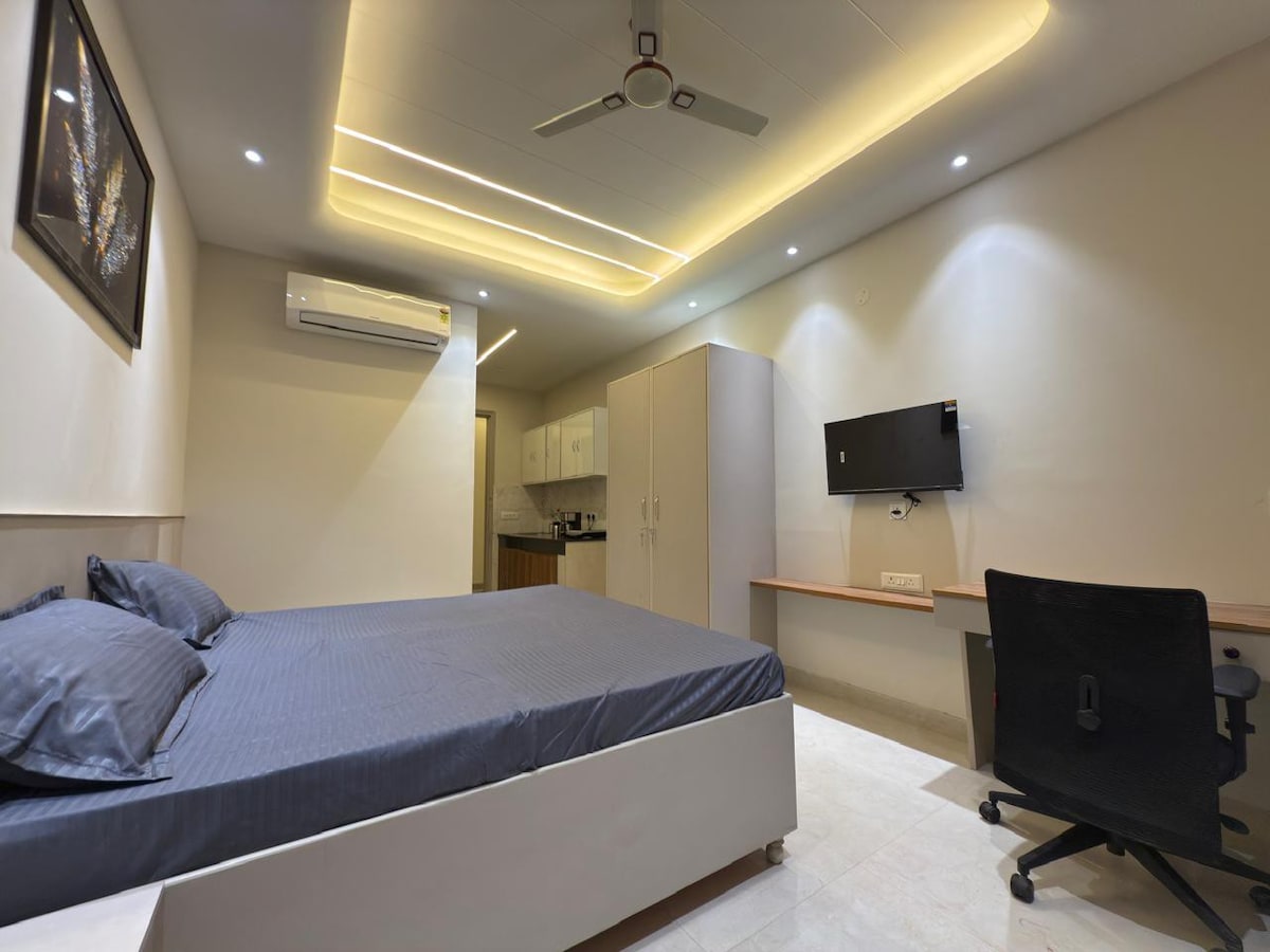 - 1 Bedroom apartment with attached with fully equipped kitchenette and bathroom is located at the ground floor of a residential building. - All the necessary amenities for a seamless experience. - Fresh towels and toiletries. - Wifi with 55' inch TV (including Netflix, Amazon prime & Hotstar etc). - couple friendly. - 6 km from IGI Airport, New Delhi. - 1.3 km from Indian Aviation Academy. - 1.4 km Indian Spinal Injury Center. - 3 km DLF Emporio Mall, Vasant Kunj. - 4 Km from Fortis Hospital