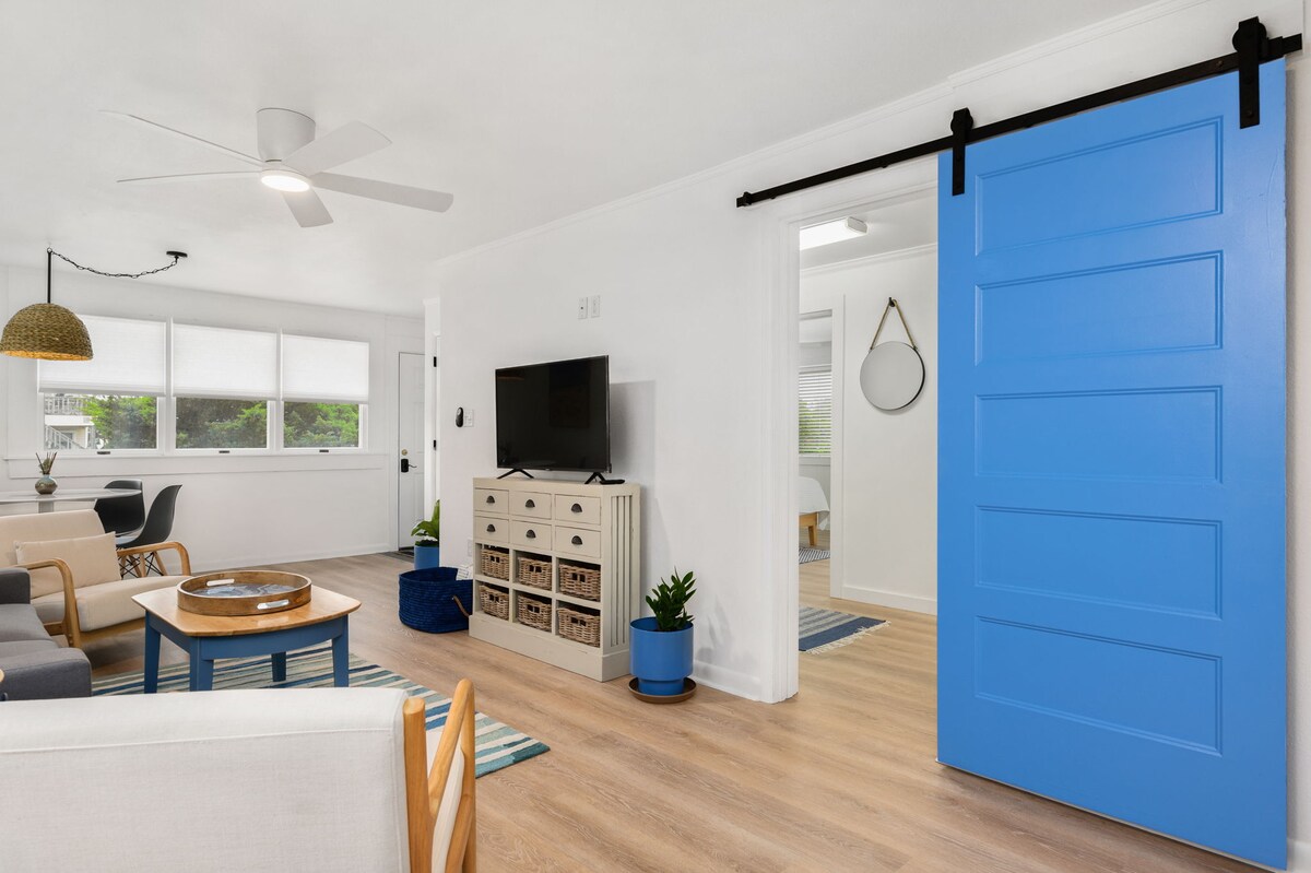 Beautiful 2 bedroom 1 bath newly renovated first level apartment. Located within walking distance to the beach in peaceful Kitty Hawk NC. Approx 3/4 mile. This charming apartment can accommodate a family of 4 . There is an open family room with a large sectional sofa and a 55 inch screen TV. Wifi/ smart TV and Netflix are available. The kitchen is equipped with Full refrigerator, 2 burners, microwave, toaster oven, large griddle, Keurig coffee maker, and dishes. Eat in kitchen or outside patio