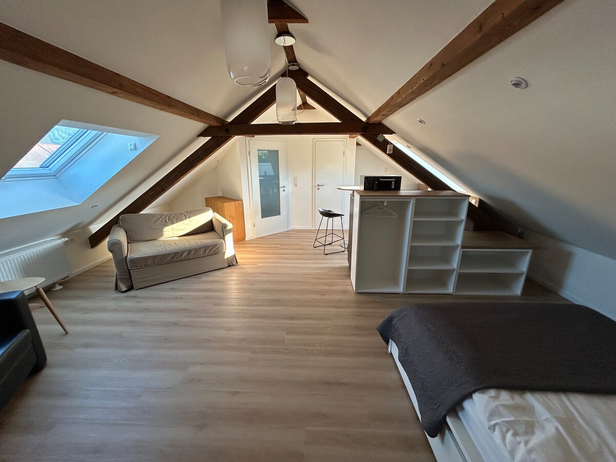 Vítej ve svém dočasném domově daleko od domova: Náš plně zařízený podkrovní byt o rozloze cca 50 m² je klidný a přesto výhodně umístěný v oblíbené čtvrti Im Schmelzerwald v St. Ingbertu. Otevřený obývací a jídelní kout je světlý a přívětivý a nabízí vše, co potřebuješ pro pohodlný pobyt. V ložnici je pohodlná postel o rozměrech 140x200 cm pro klidné noci. Samozřejmě je k dispozici wifi a televize.