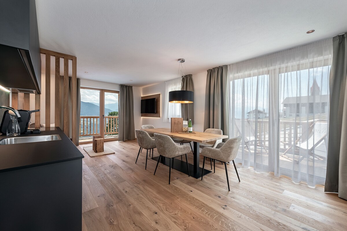 NEW: This top-floor apartment, featuring two terraces and large sliding windows, is located within the historic old town. It offers stunning views to both the north and south. Lovingly and extensively renovated three years ago, it now serves as our vacation home. A perfect retreat for enjoying Brixen and its surroundings and equally ideal for simply staying in: contemplating, reading, cooking, or just soaking in the beautiful views.
