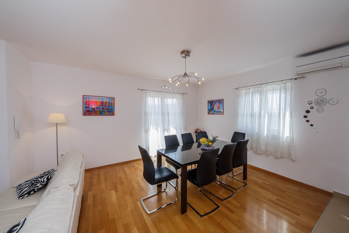 The modernly furnished apartment has a room with a separate air conditioning, TV and modern lighting. The kitchen is equipped with dishwasher, ceramic plate, microwave and all the equipment. The living room has sofas for a third person and its tv and air conditioning. The apartment has a beautiful terrace overlooking the sea, ancient Salon and Split. Guests can use our swimming pool and barbecue in the garden.