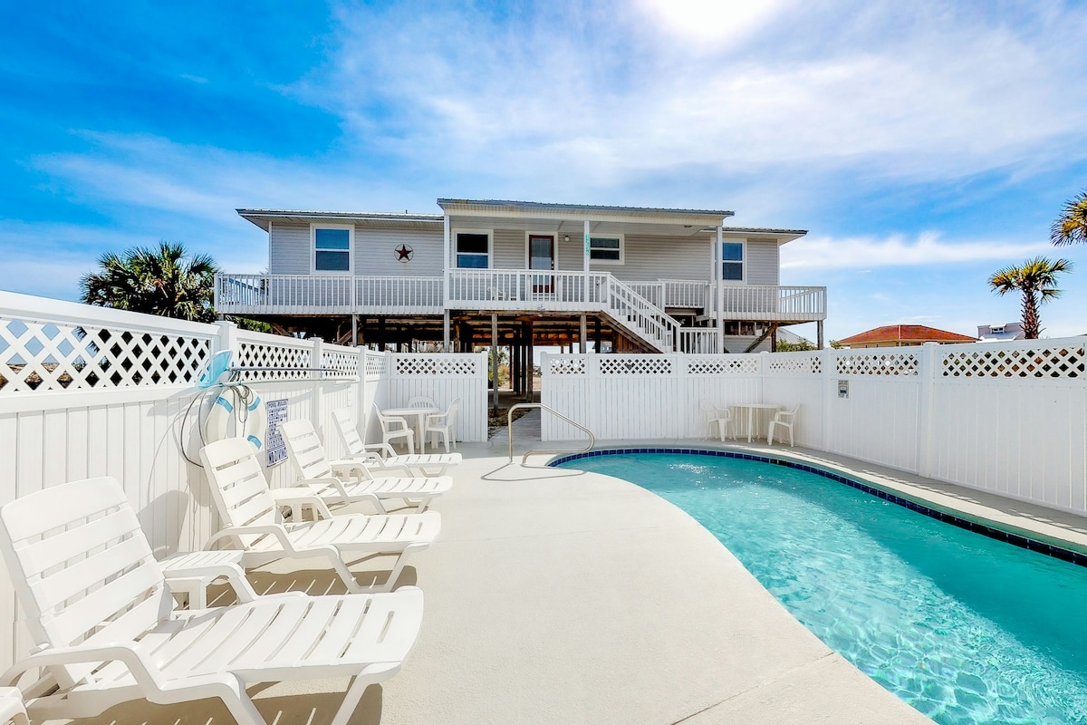 Just over the dune line road from quiet east end beaches. Great fishing and uncrowded relaxing. Excellent for families or couples (4 person maximum) with private spaces indoor and out. Two master bedrooms with kings and pillow tops. Second floor remodeled and decorated (photos Feb 2026). Shared pool and gulf views from front room and master. Front Deck. Large furnished screened porch. You will be hard pressed to find a better spot for your vacation dollars. Beach wagon, canopy and chairs.