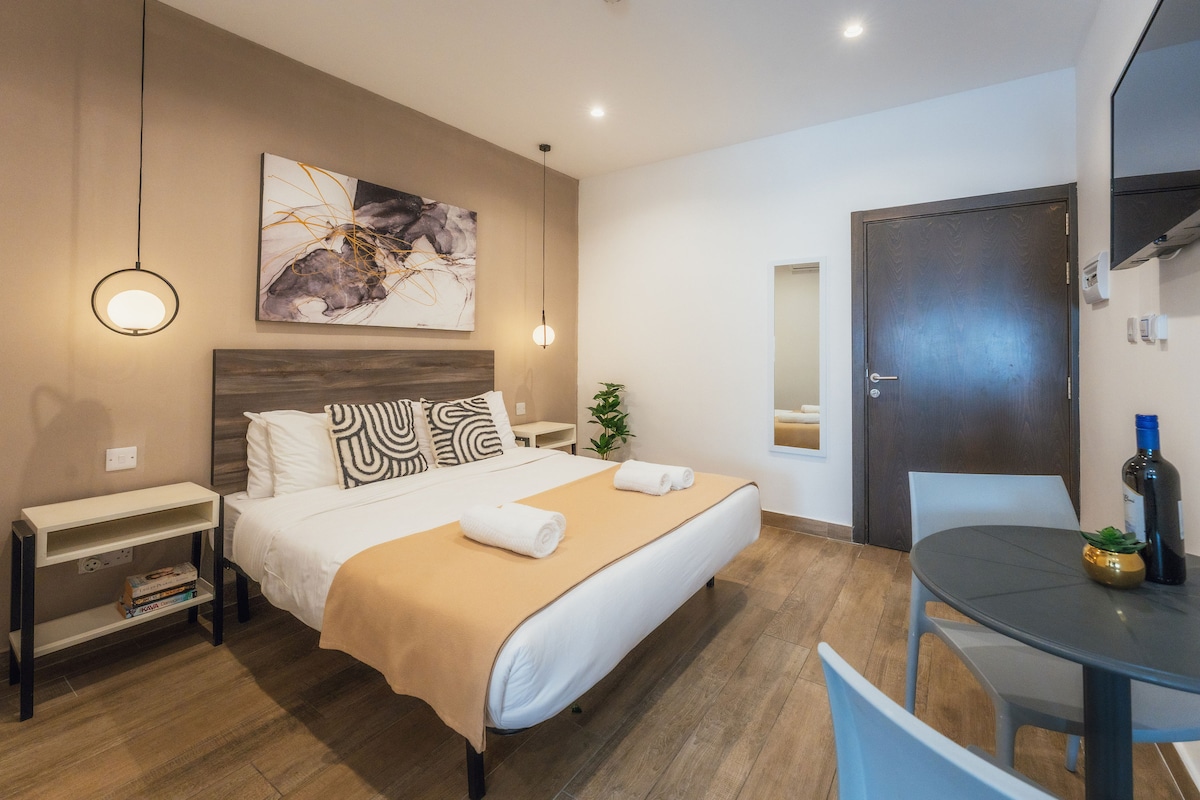 Útulné studio v blízkosti St. Julian's! Ideální pro páry nebo malé skupiny (až pro 3 hosty). Prostor nabízí pohodlnou manželskou postel a rozkládací pohovku. Užij si prostornou soukromou terasu s grilem a markýzou – ideální pro slunečné snídaně nebo večerní drinky pod hvězdami. Nachází se pouhých 5 minut od St. Julian's a pouhých 10 minut od nejlepších maltských pláží, anglických škol, restaurací a rušného nočního života v Paceville. Výška stropu: 188 cm (196 cm v kuchyňském prostoru)