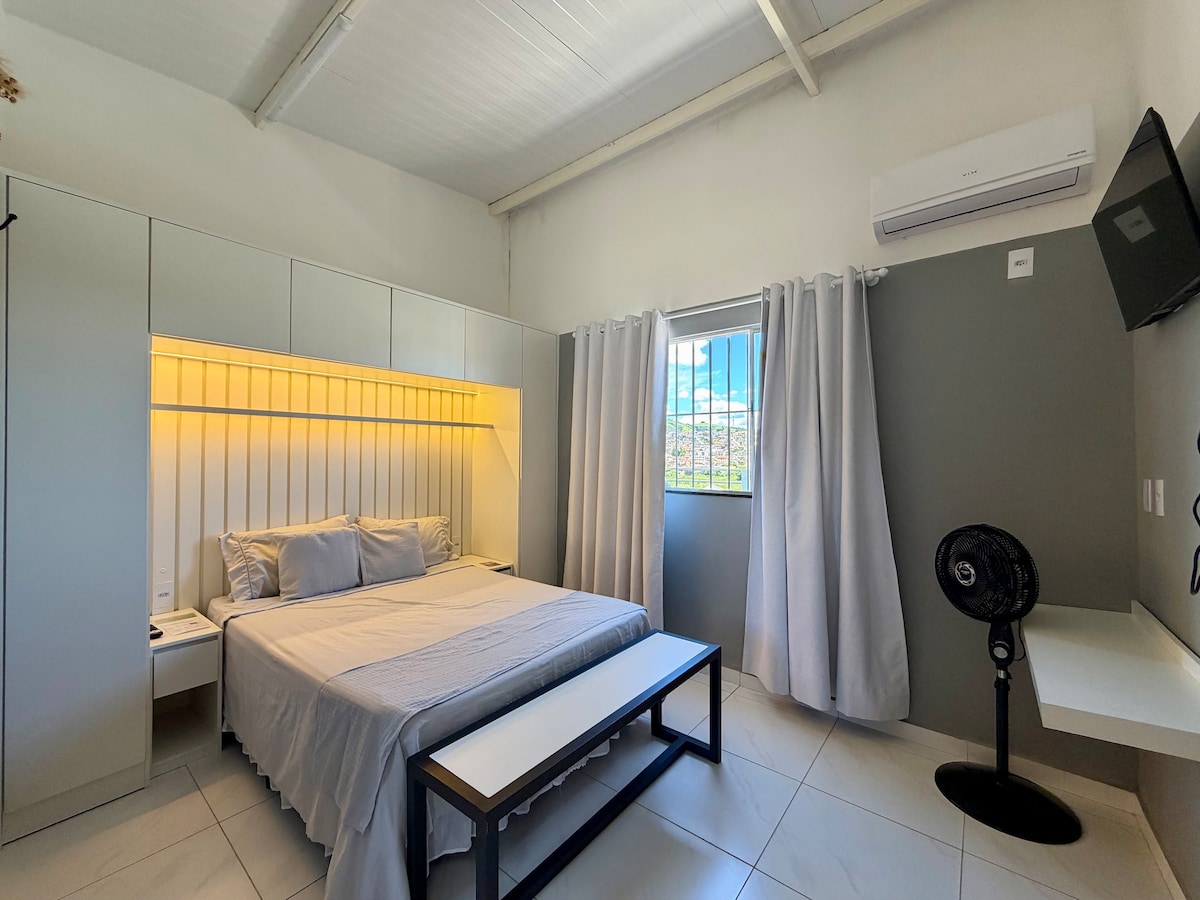 ⚠️ Acesso por escadas. ⚠️ Não servimos refeições, mas há excelentes padarias e cafés nos arredores. Hospede-se na Casa das Fontes, um loft charmoso e moderno em São Lourenço, ideal para quem busca conforto, tranquilidade e praticidade. A apenas 800 m do Parque das Águas, oferece ambiente silencioso, Wi-Fi rápido, cama confortável, ar-condicionado e cozinha equipada. Self check-in garante total autonomia. Local seguro e acolhedor.
