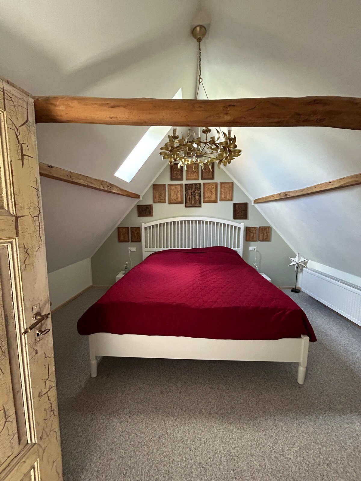 Bývalá kongregace původní farmy byla láskyplně přeměněna na prostorný podkrovní byt. Byt, vestavěný do štítu, vyzařuje velmi zvláštní kouzlo. V apartmánu o rozloze 75 m² je ložnice s manželskou postelí a dětskou postýlkou a velký obývací pokoj s otevřenou, plně vybavenou kuchyní. Moderní koupelna má sprchový kout s nástěnným topením.