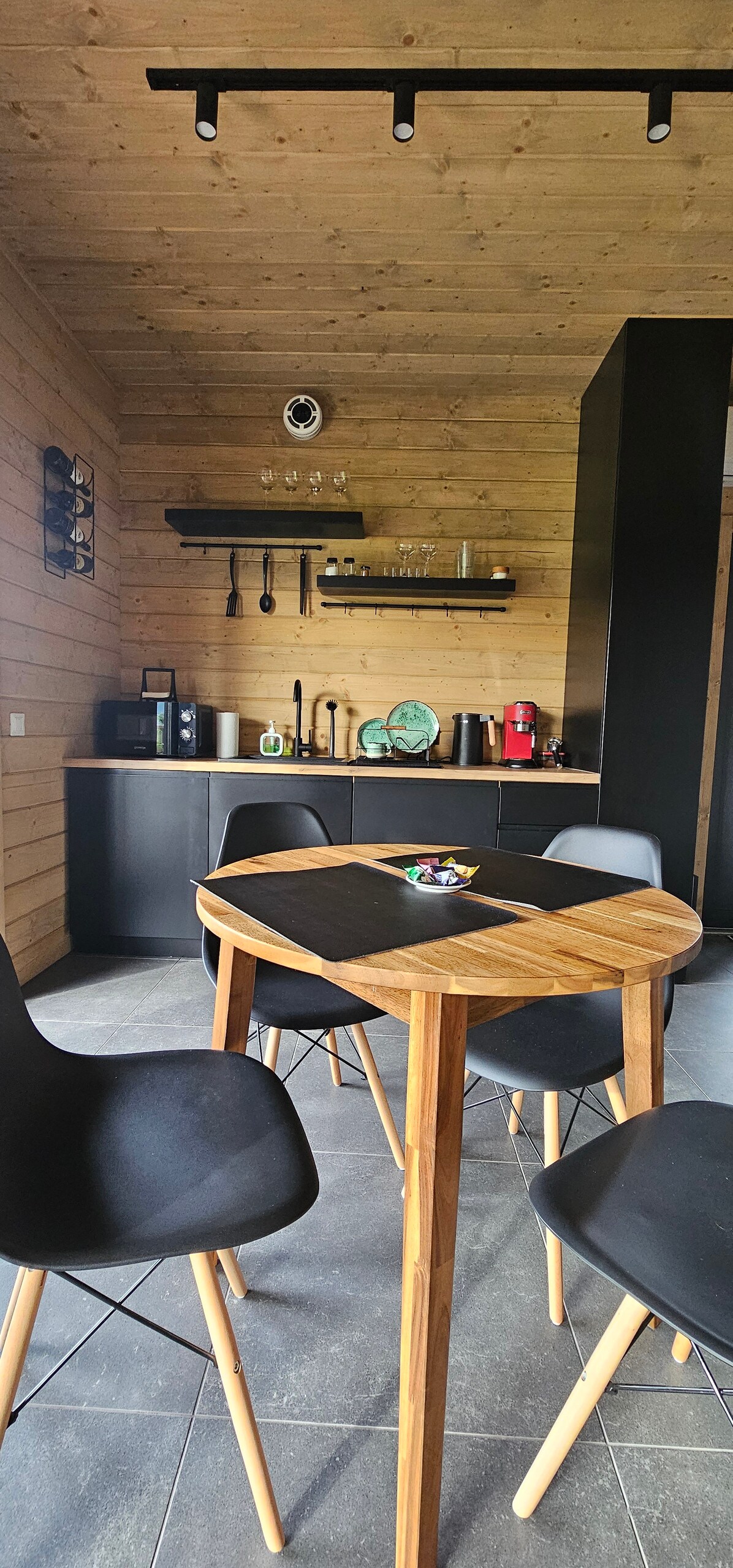 Vítej v The Forest House. This is one of two houses available for booking in Space. Obytná plocha – 35 m². K dispozici je prostorná veranda – 12 m² a obrovská střešní terasa – 40 m². „Les“ je určen až pro 4 osoby. Postaveno z kvalitních materiálů šetrných k životnímu prostředí na modulární technologii. Výhled na hrad, soukromá ložnice, kamna na dřevo, terasa s výhledem na střechu, kuchyně. V ceně je zahrnuto: využití vyhřívaného bazénu, velký altán s grilem, dětské hřiště. K dispozici je sud navíc.