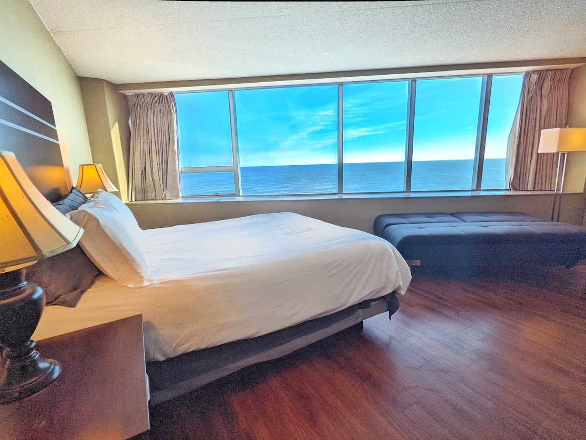Ocean přední studio s úžasným výhledem po celé pláži. Sledujte východ slunce nad oceánem, slunce u bazénu ve třetím patře, vyjděte předními dveřmi na světově proslulou promenádu... Jen pár kroků od nočního života, jídla, slunce a kasin, aby naše přední studio oceánu váš domov v Atlantic City. Nabízíme kuchař top, mikrovlnná trouba a koleji lednice, takže si můžete ušetřit nějaké peníze vařením nebo ohřevem, zatímco snadno vystoupí na jeden z desítek úžasných restaurací v okolí.