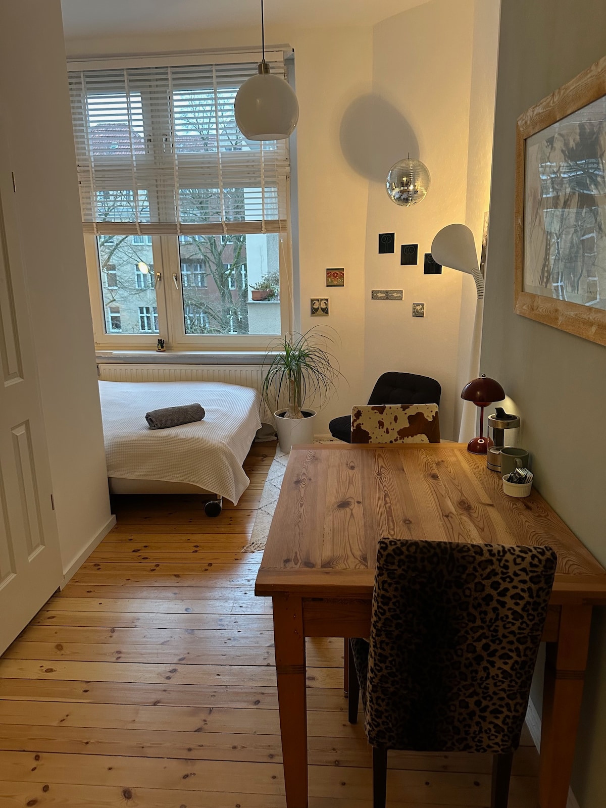 Náš byt se nachází v typickém berlínském "Altbauwohnung" (postaven kolem roku 1900). K dispozici je jedna ložnice, obývací pokoj s rozkládací pohovkou, kuchyň a koupelna. Je to náš domov, ale rádi ho zpřístupníme ostatním v duchu ekonomiky sdílení. Byt se nachází ve Steglitzu v jihozápadním Berlíně. Nachází se v klidné obytné ulici, ale jen dvě minuty od hlavní nákupní ulice a stanice UBahn.