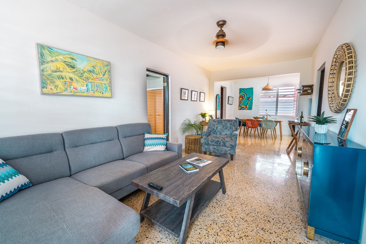 This unique beach house w/pool, is in the quaint, desirable community of Sea Beach Colony, in the heart of Rincon. Featured by Forbes Magazine as the best family Airbnb in PR! Ocean views, steps from the beach, walking distance to all. Filled with art, & lovely furnishings, this tropical home offers the experience of Caribbean coastal life. Sleeps 5 total / 2 bdrm/1.5 bth in Main house, Casita -1 full w/full bath for guests. The outdoor kitchen, dining & living room are magazine worthy. AC/WIFI