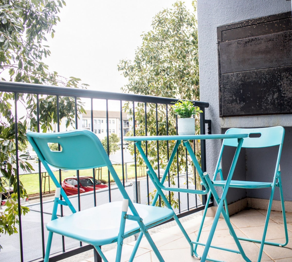 Compact flatlet with private entrance and outdoor dining space as well as secure parking behind a gate. This space boasts a modern bed-desk for business and recreational screen-time or breakfast in bed. This suburban living space allows for close access to malls and main roads but also for beautiful strolls in the nearby vineyard. Newly renovated with all the essentials for anyone including traveling persons/couples, businessman/businesswoman and anyone in between.