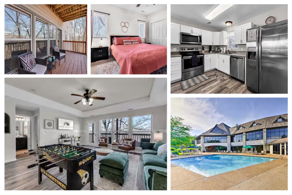 Vítejte v našem apartmánu v Notch Estates! Méně než 2 míle od Silver Dollar City a několik minut od Branson Strip & Table Rock Lake. Můžete očekávat moderní, zábavné a čisté místo, kde si užijete svůj pobyt. Vyspí se zde až 6 osob. Dvě ložnice mají manželské postele a je zde rozkládací pohovka. Výhled na les a v blízkosti jednoho ze 2 venkovních bazénů (otevřeno od května do září), stezky, jezero, hřiště, parkoviště pro lodě. Když se ubytuješ v tomto apartmánu v srdci dění, s rodinou to budete mít kousek na všechna zajímavá místa. Pro rezervaci musí být hostovi 21 let.