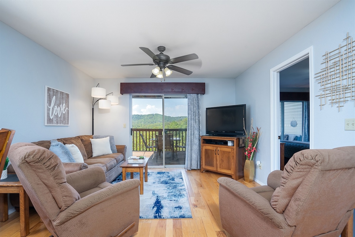 Tento rekreační apartmán Branson se nachází v klidném komplexu uprostřed více než 300 akrů zalesněných hor Ozark. Užijete si apartmán, který má skvělé světlo a krásný výhled na Ozark Mountains! Naše manželská postel má pohodlnou 4palcovou pěnovou vrstvu, která vám poskytne extra pohodlí a skvělý spánek daleko od domova. V obývacím pokoji je velmi pohodlná pohovka (s manželskou postelí) a velká televize, takže si můžete odpočinout po zábavném dni u jezera nebo v Bransonu.