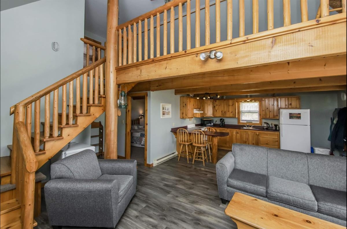 Kick back and relax in this spacious lakeside heat pump, infloor heated cottage, new August 2023. The separate bedroom with queen bed, has a beautiful barn slide door. The main living area has a queen sofa couch. Enjoy gorgeous sunsets or a campfire by the lake . For your added pleasure is a six man, hot tub, nestled in the woods under a beautiful gazebo - shared with one (2 person) cottage. Free use of kayaks, paddle boards, mountain bikes, swim in the lake, or enjoy leisure walks.