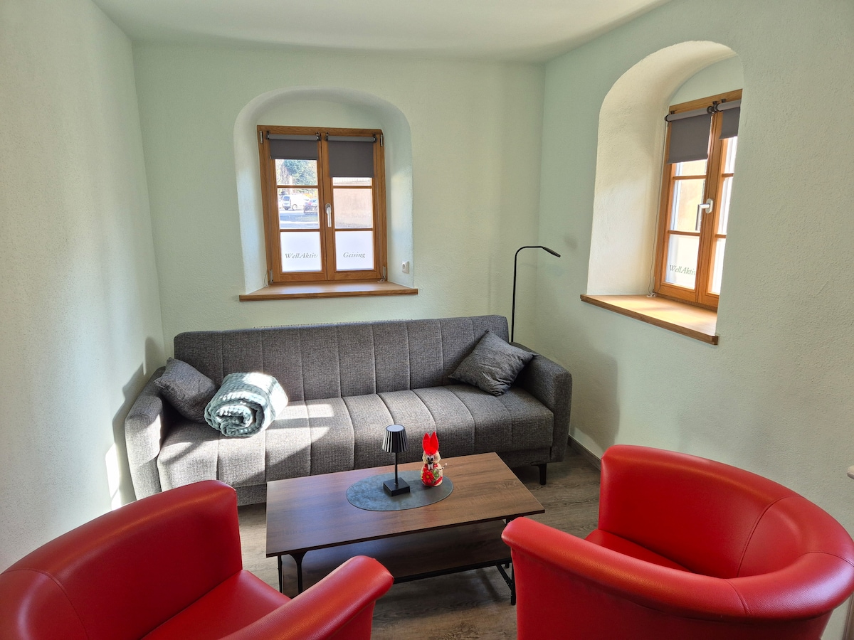 Velmi stylový jednopokojový byt (rozkládací pohovka!) se samostatnou sprchou, 31 metry čtverečními obytné plochy, samostatným vchodem a přístupem do Fasssauny, realizovaný ve spolupráci architekta, interiérového designéra a designéra nábytku. Veškerý nábytek je vyroben na zakázku, kuchyňská pracovní deska a snídaňový bar jsou z betonu/dřevěné vložky/epoxidové pryskyřice. Sprchový kout s betonovou stěrkou, přičemž sprcha a WC nemohly být odděleny z důvodu velmi omezeného dostupného prostoru.