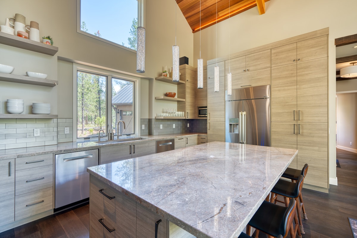 Stylový luxusní rodinný dům s 8 vstupenkami do SHARC (bazén a lenivá řeka), 6 jízdními koly, vířivkou, 3 novými chytrými televizemi pro streamování, pingpongovým stolem, stolními hrami. Krátká procházka k řece a mostu Cardinal Landing Bridge. Rychlá 1GB WiFi, propan BBQ, klimatizace, útulný krb na dřevo. Plně zásobená kuchyň na vaření, prádelna uvnitř. Tiché a soukromé s velkou terasou, která přechází do přírodního společného prostoru s procházející divokou zvěří. Snadný přístup na kole všude. Minuty do Mt Bachelor pro lyžování a sáňkování.