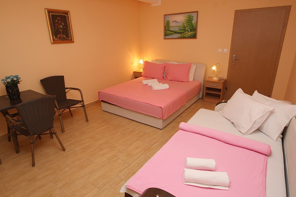 Útulné studio s vysokorychlostním WiFi je vybaveno manželskou postelí, koupelnou, kuchyňským koutem a jídelním koutem. Velikost bytu je 23 m2 s 10 m2 terasy a je situován v přízemí, 20 m od pláže. Pláž je vybavena lehátky, která jsou pro naše hosty zdarma. Parkovací místo je zdarma. Pokud potřebujete dobré soukromé parkovací místo v blízkosti bytu, stojí 5 eur za den