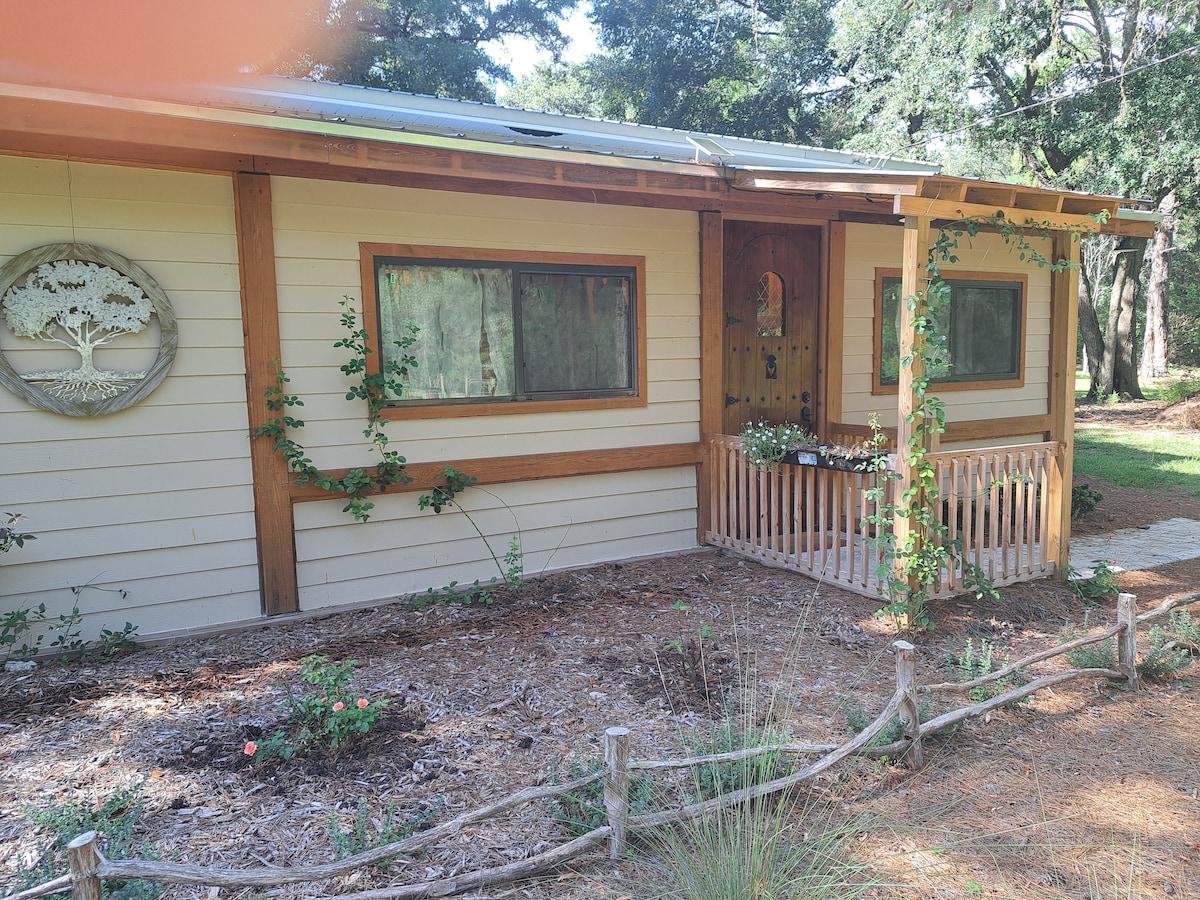 Relax at this cozy, tranquil cottage on our small farm in the country outside Gainesville yet close to Santa Fe College, High Springs and Alachua. Compact cottage has a full kitchen and bath, queen bed, twin air mattress, indoor seating and outdoor picnic area. We have a few friendly alpacas, chickens, dogs, and assorted birds. Well cared for pets welcome, property is fully fenced. Great place to stay to explore the springs, go antiquing, or check out Gainesville's food, music and fun.