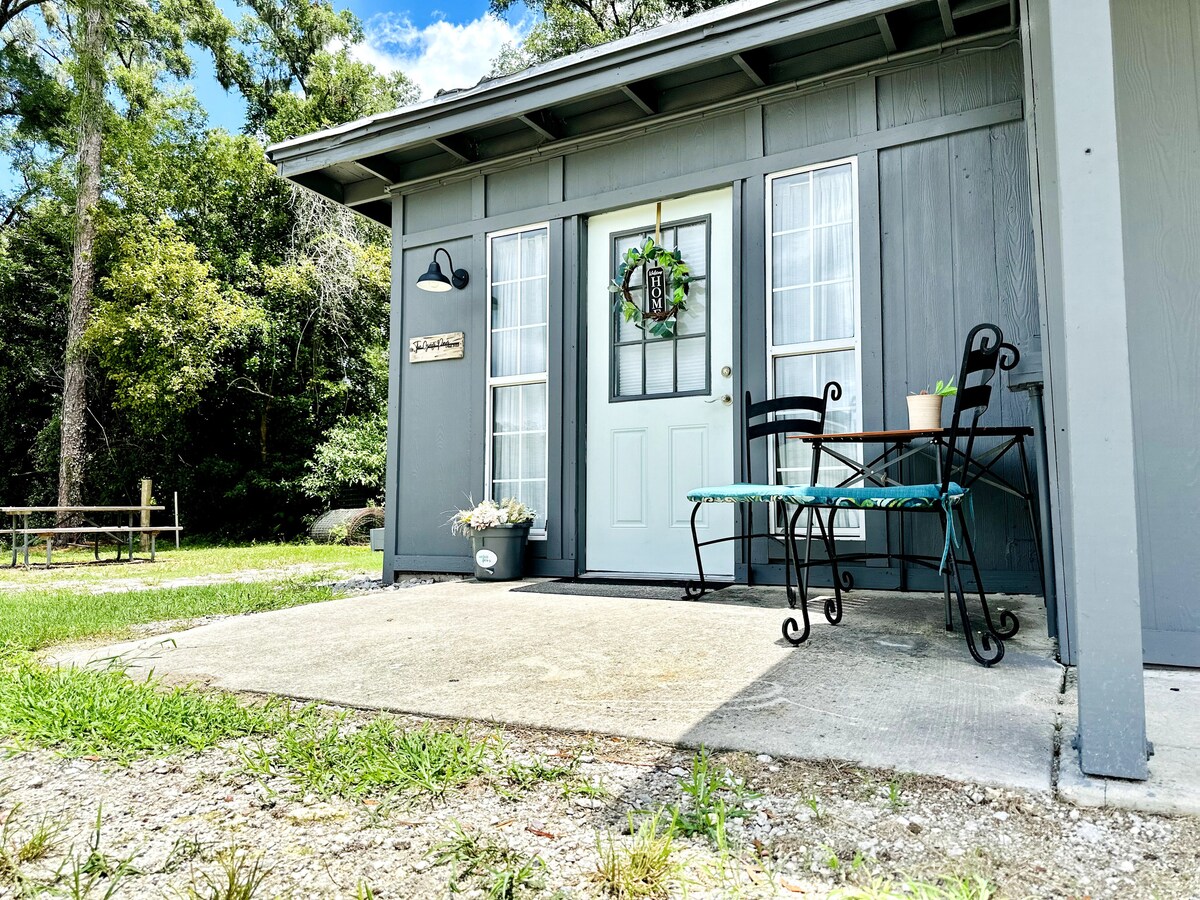Cute, cozy, freshly remodeled, private guest house on a beautiful 5 acre farm. Enjoy your own backyard herb garden with privacy fence, picnic table and fire pit. New kitchen with gas stove, microwave, toaster oven, coffee-maker, and dining area perfect for enjoying meals. The bedroom is equipped with a smart TV, queen bed, & extra blankets. This country getaway is near the University of Florida (12 miles), Blue Springs (21 miles) Ginnie Springs (24 miles), and historic High Springs (15 miles).